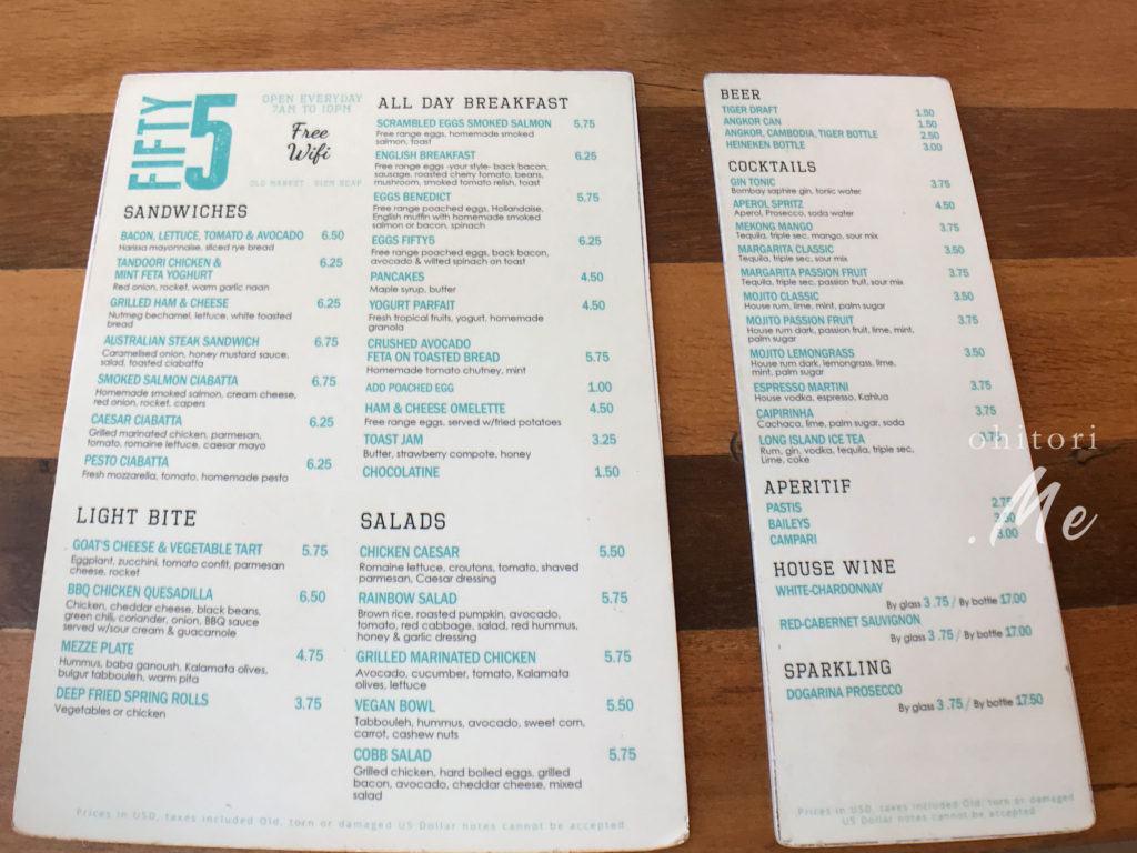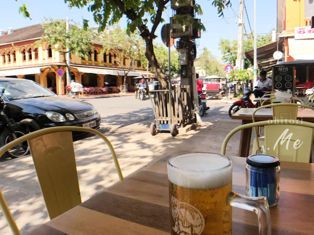 カンボジアで代表的な銘柄は『アンコール(Angkor)ビール)』。地元のスーパーやコンビニで缶ビールは0.6ドル(70円くらい)程度。このカフェではUS1.5ドル(160円くらい)しますが、それでも手頃でしょう。